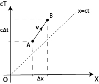 Si osservi che nel grafico c∆t indica la distanza che percorre la luce nel tempo ∆t (che separa i due eventi A e B); mentre la linea tratteggiata di riferimento indica la linea di universo di un raggio di luce (essendo x=ct).
